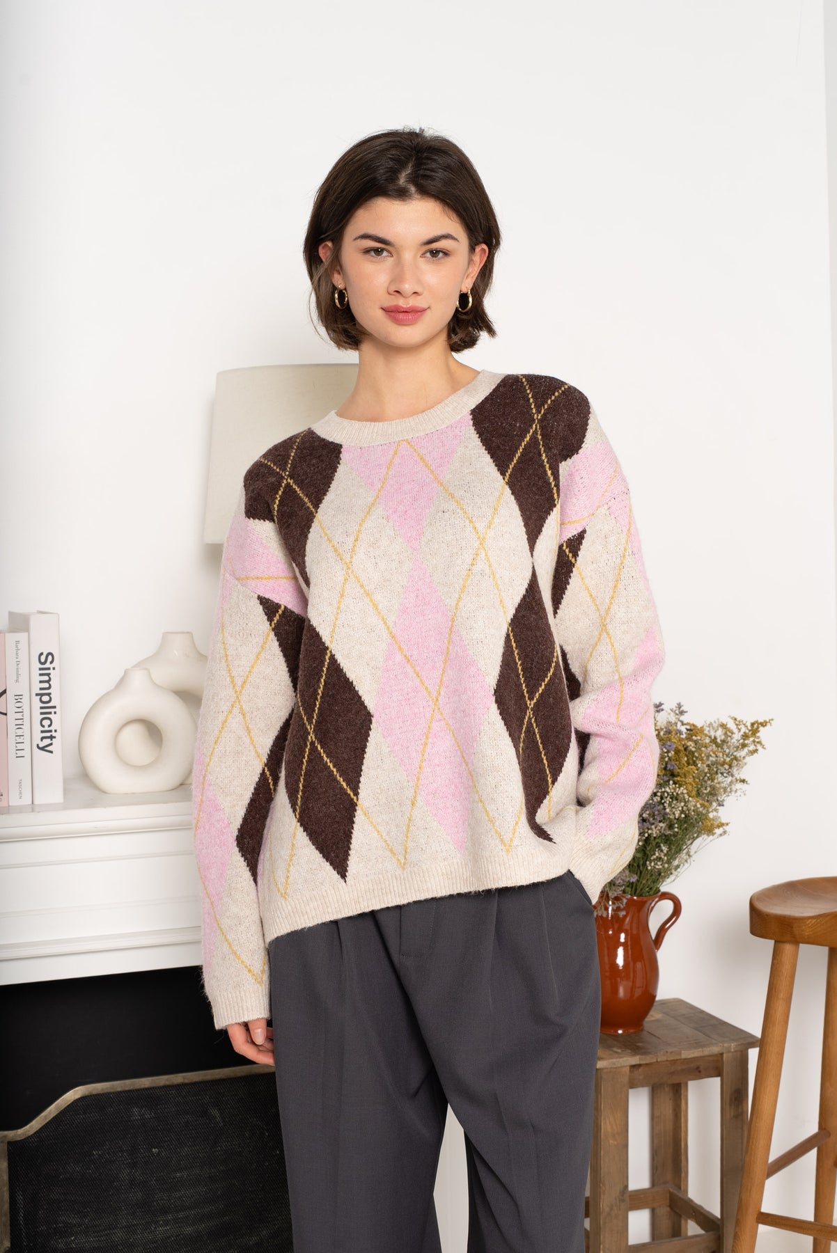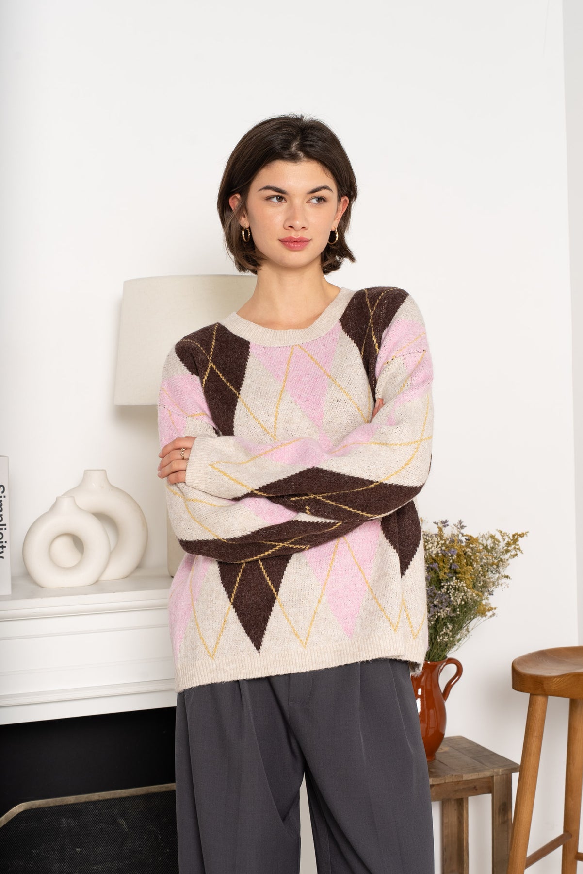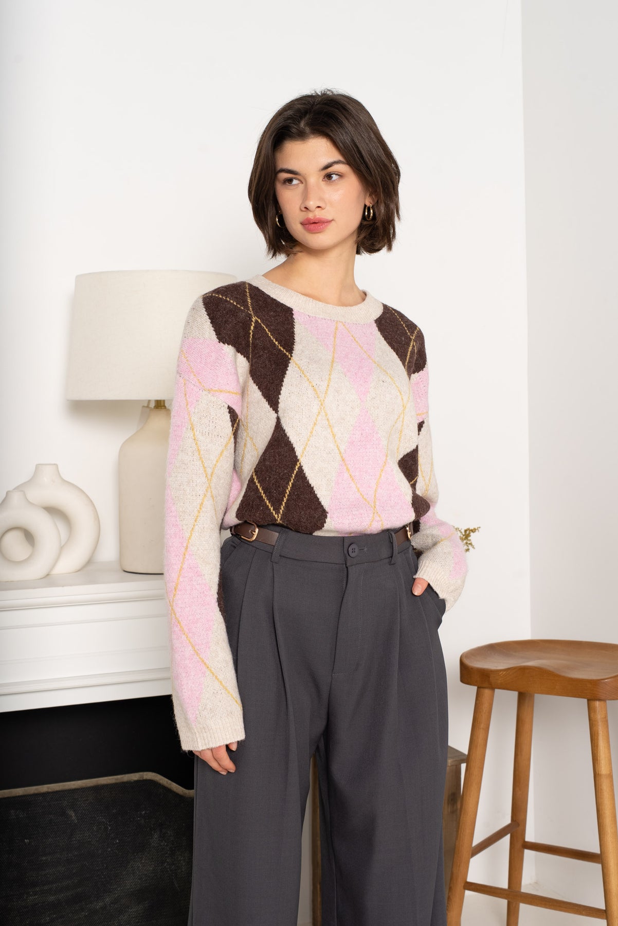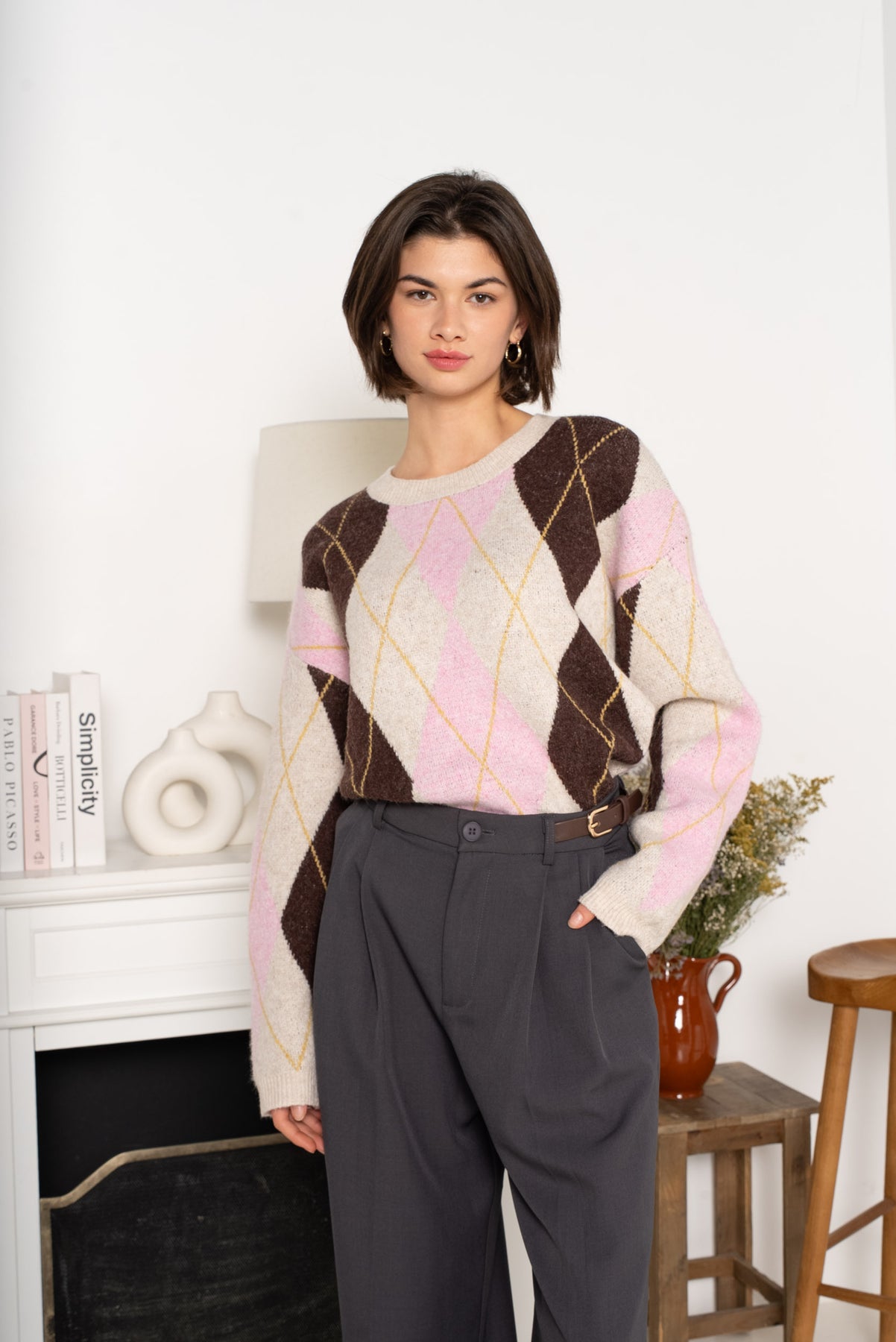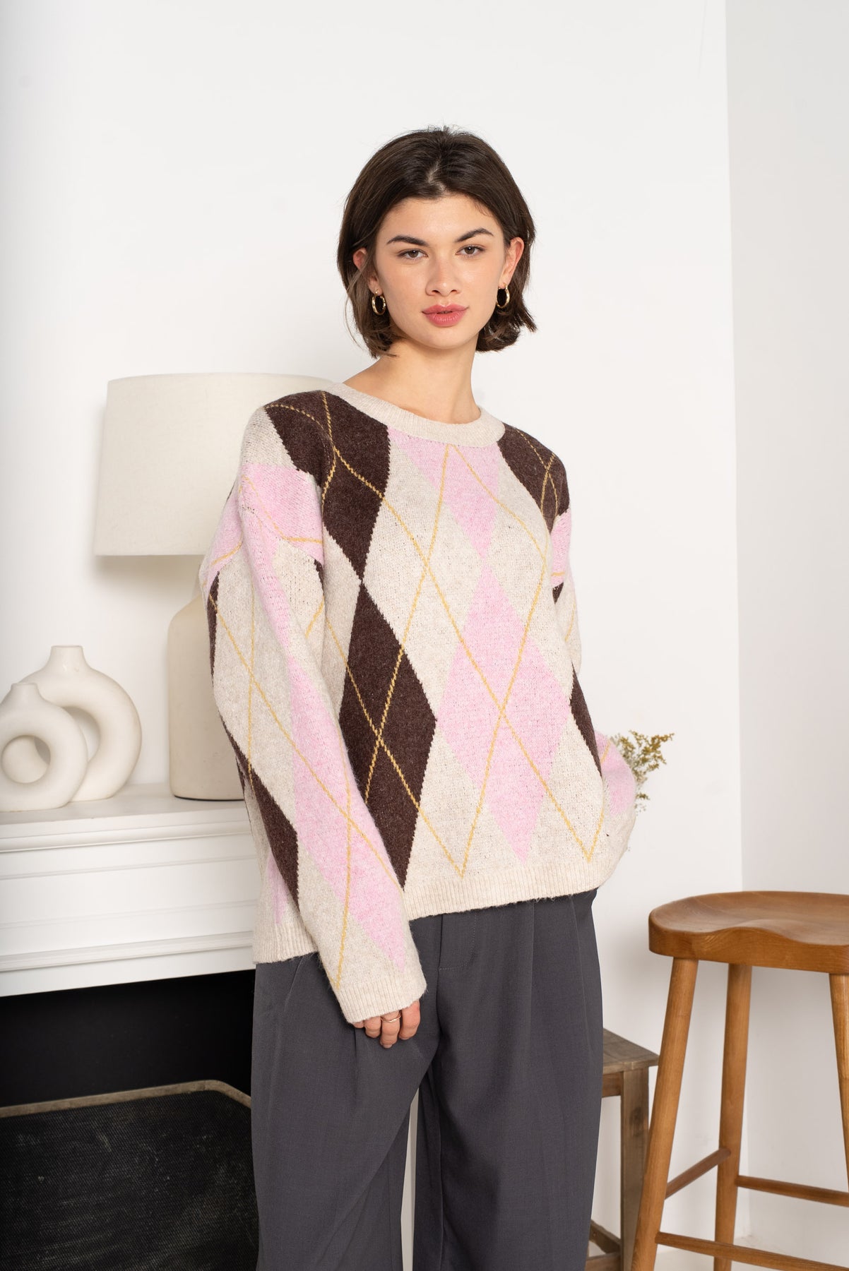 The Alba Argyle Knit Jumper is a cosy classic with a modern edge. Featuring a soft coffee and pink argyle pattern, this jumper is perfect for adding warmth and style to your everyday wardrobe.