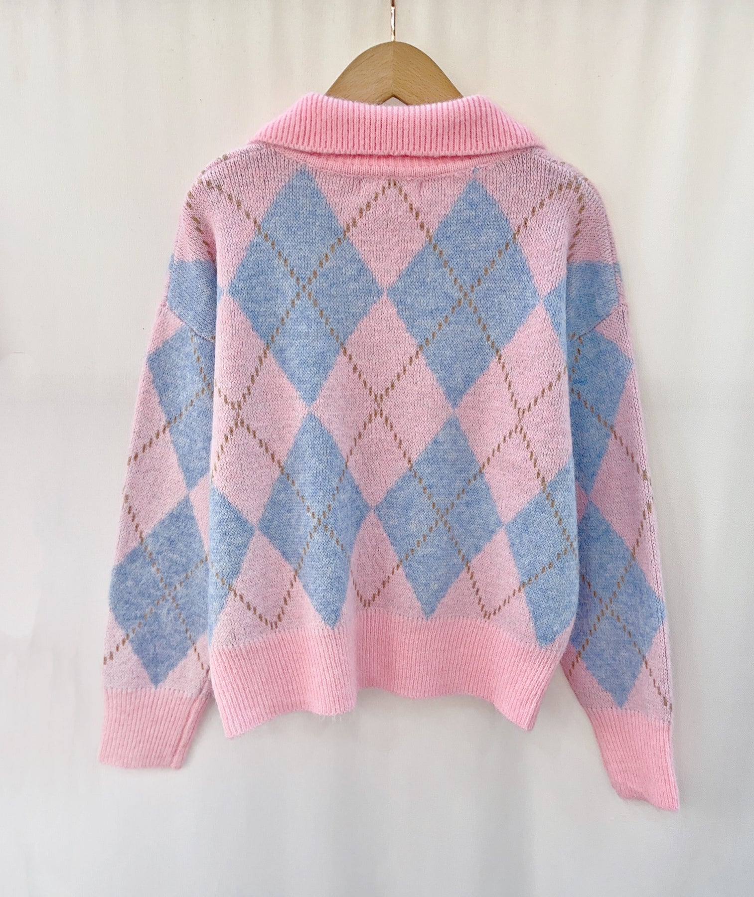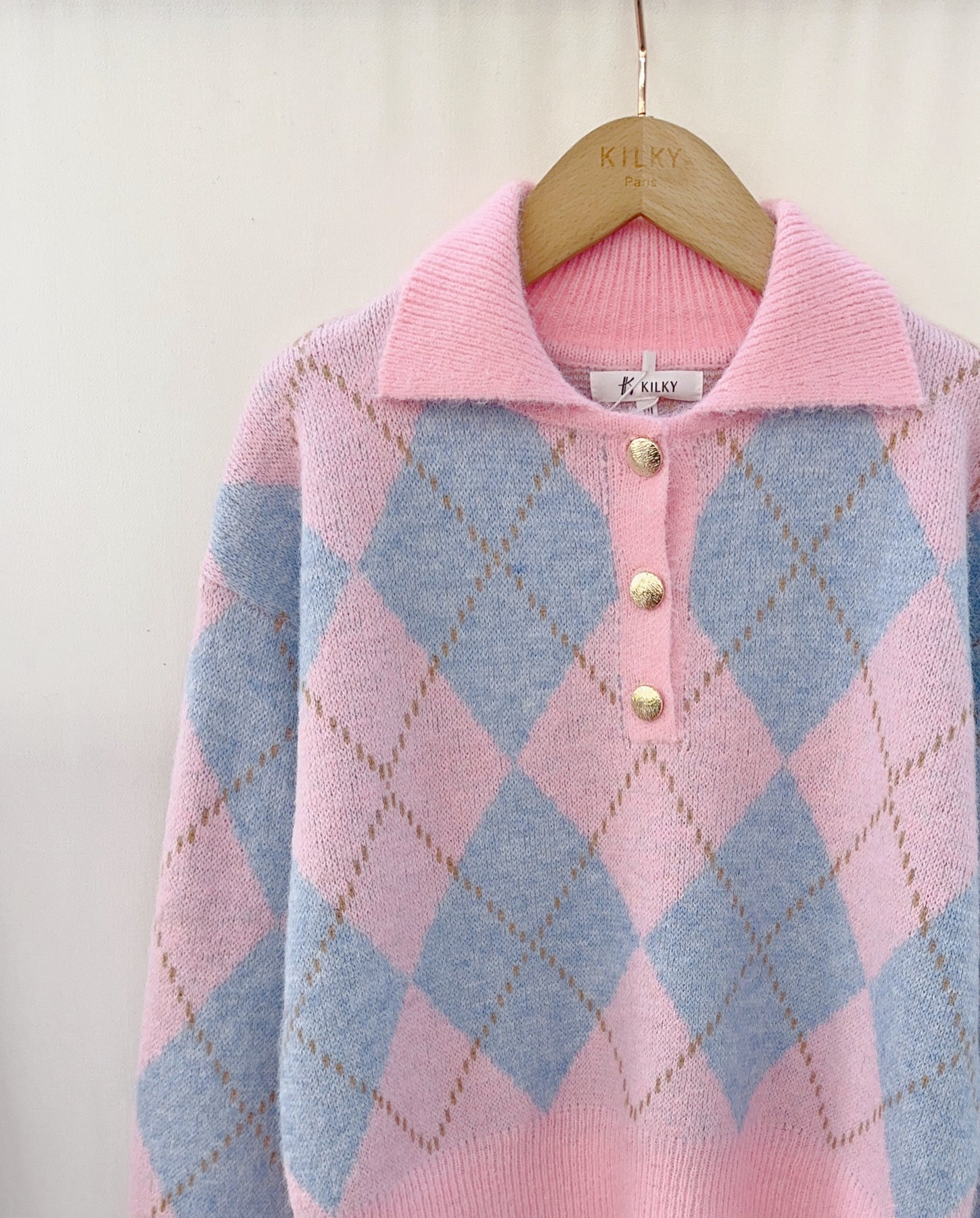 Soft, sweet and effortlessly stylish, the Bella Argyle Knit in baby pink and blue is the ultimate feel-good jumper. The pastel colour palette paired with a classic argyle pattern gives this piece a timeless yet playful look. Finished with a relaxed collar and elegant gold buttons, it’s perfect for everyday wear while still feeling special.