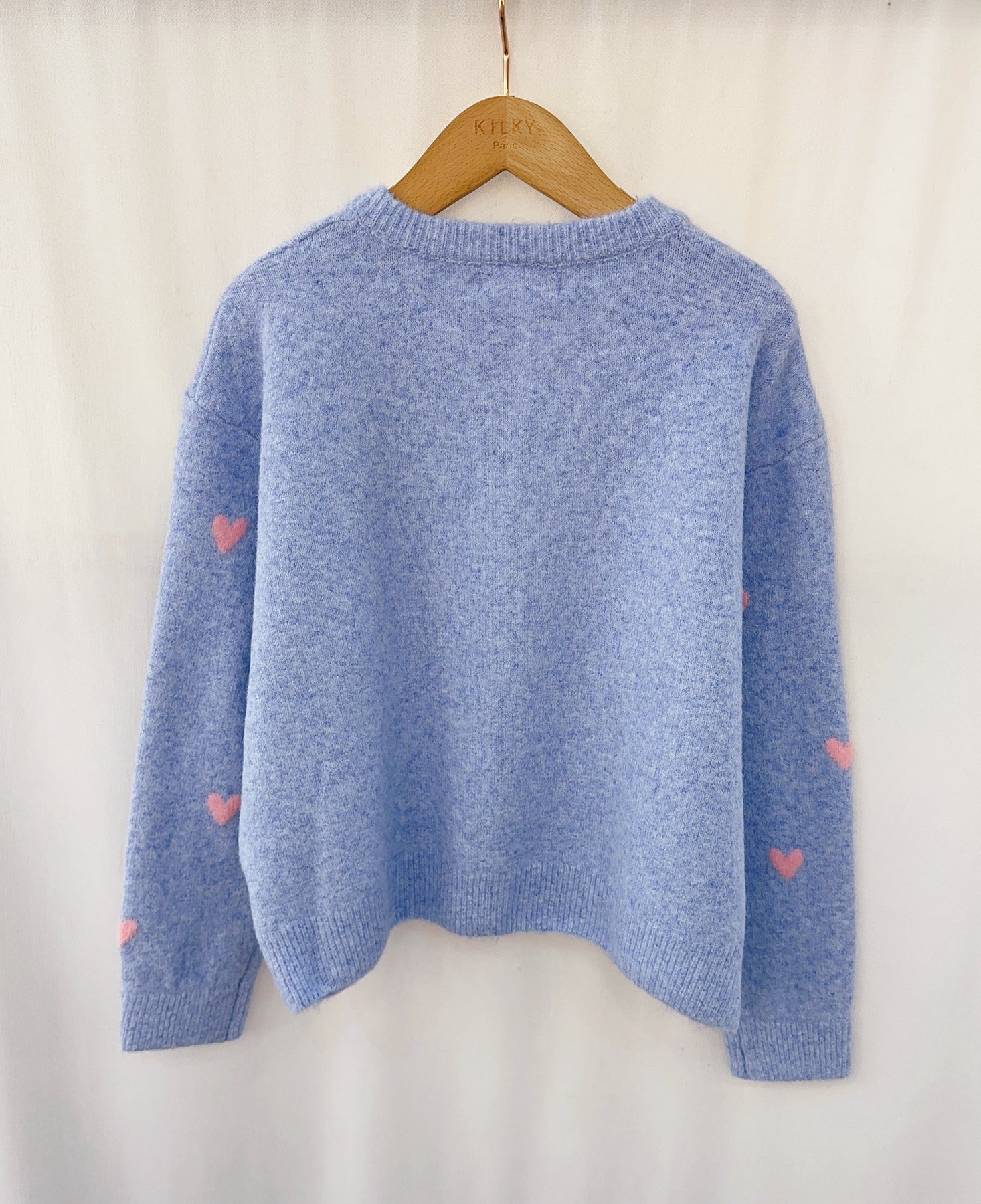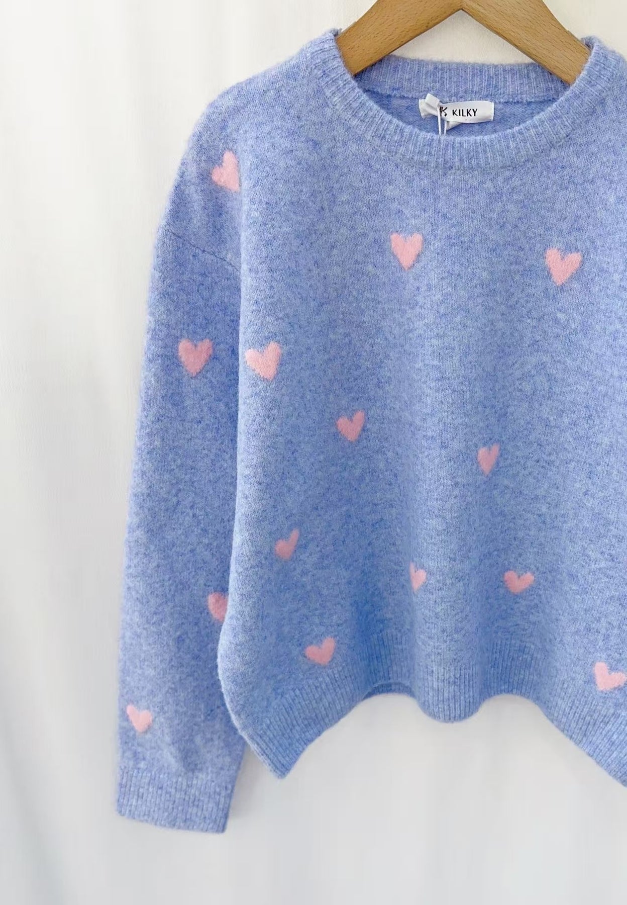 Say hello to Una 💕 — the softest, prettiest knit you’ll reach for again and again. This dreamy blue jumper is scattered with delicate pink heart detailing, giving it that perfect mix of cosy and cute.