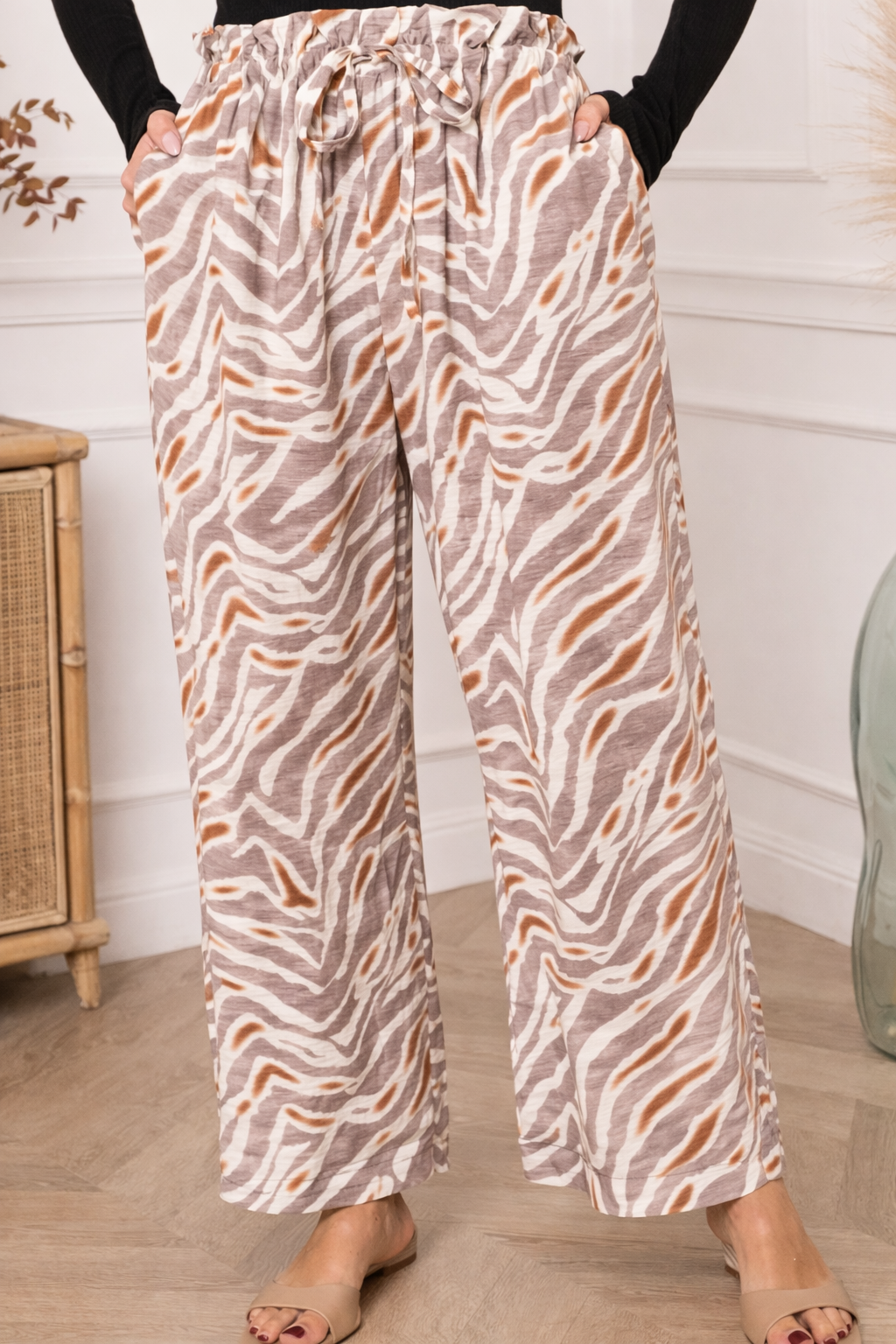 The neutral zebra-inspired print adds subtle interest while remaining easy to style, making these trousers a perfect everyday piece. Designed with a comfortable elasticated waistband and adjustable tie, plus a relaxed wide-leg fit, Cleo offers all-day comfort without sacrificing style.