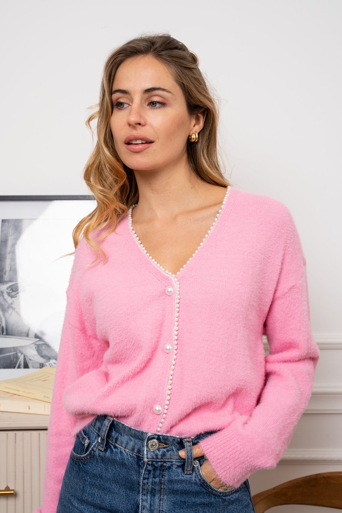 Elevate your everyday style with the Vanessa Pearl Trim Cardigan in Pink. Designed in a luxuriously soft knit, this cardigan features a flattering V-neckline finished with elegant pearl buttons for a touch of timeless femininity. The relaxed fit makes it effortlessly versatile — layer it over dresses for a chic evening look or pair with jeans for casual sophistication. A classic neutral you’ll love reaching for season after season.